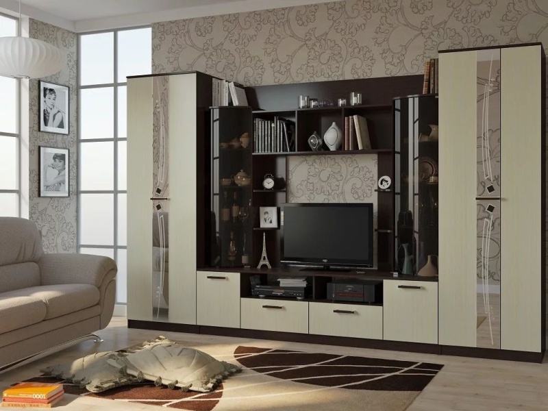 В состав стенки входят: плательный шкаф с параллельной штангой с левой стороны, шкаф с полками для белья с правой стороны, два вертикальных стеллажа с изогнутыми дверцами из тонированного стекла, по бокам ниши под ТВ открытые полукруглые полки и открытые полки сверху. Под нишей имеются две открытые полки и несколько закрытых шкафчиков с распашными дверцами.